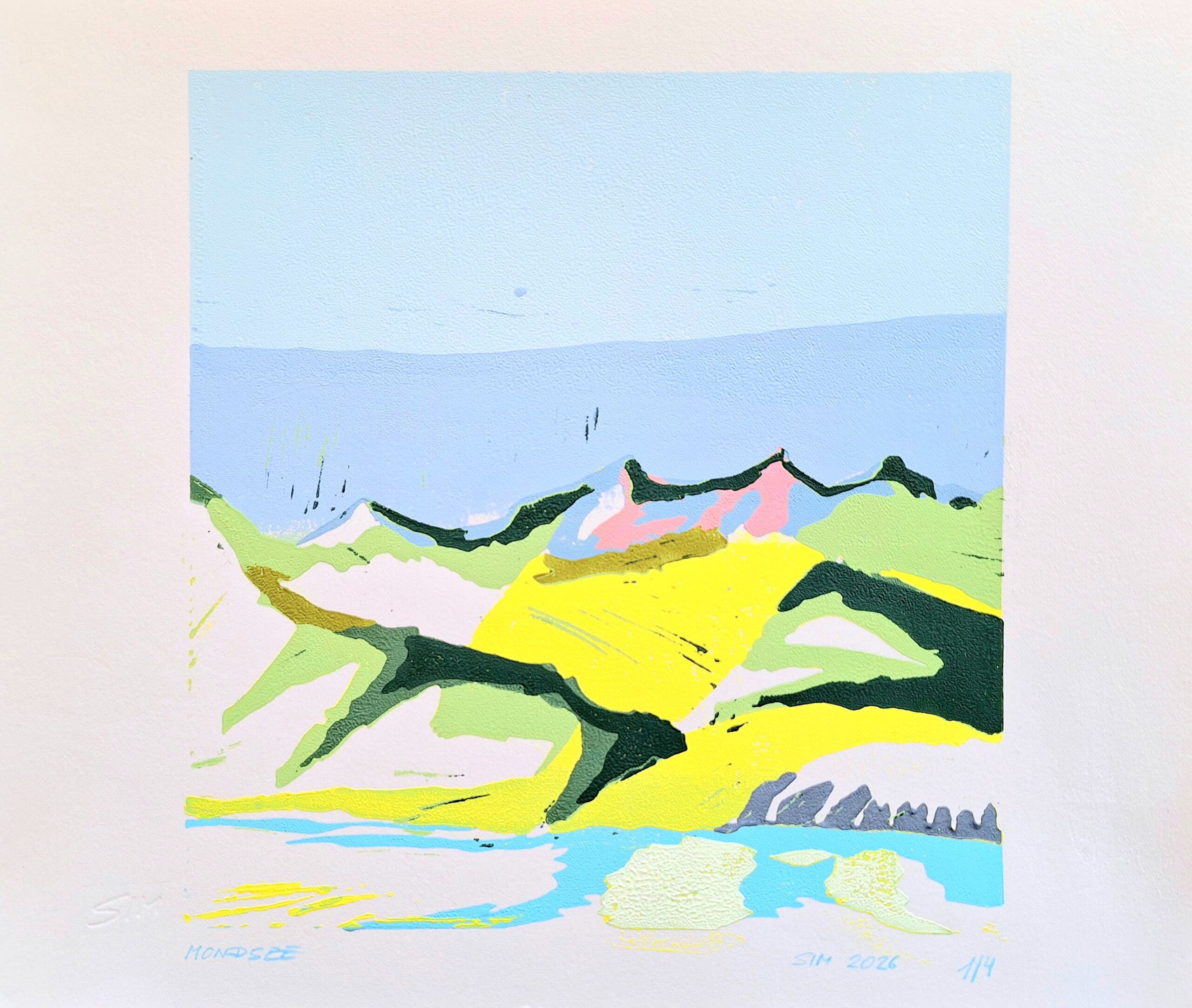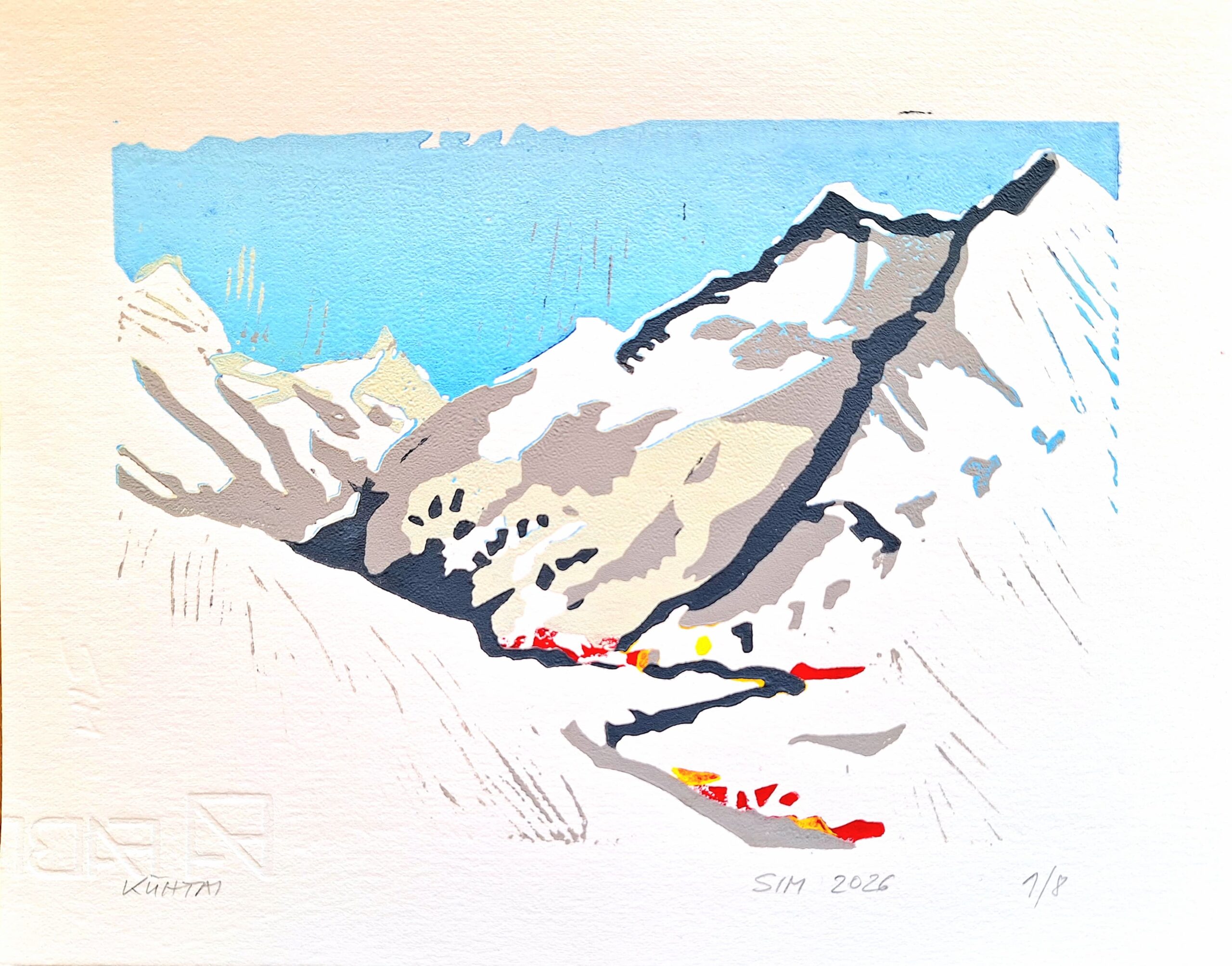 „Riepenwand Kalkkögel“, Farblinocut, © Beate Simmerle